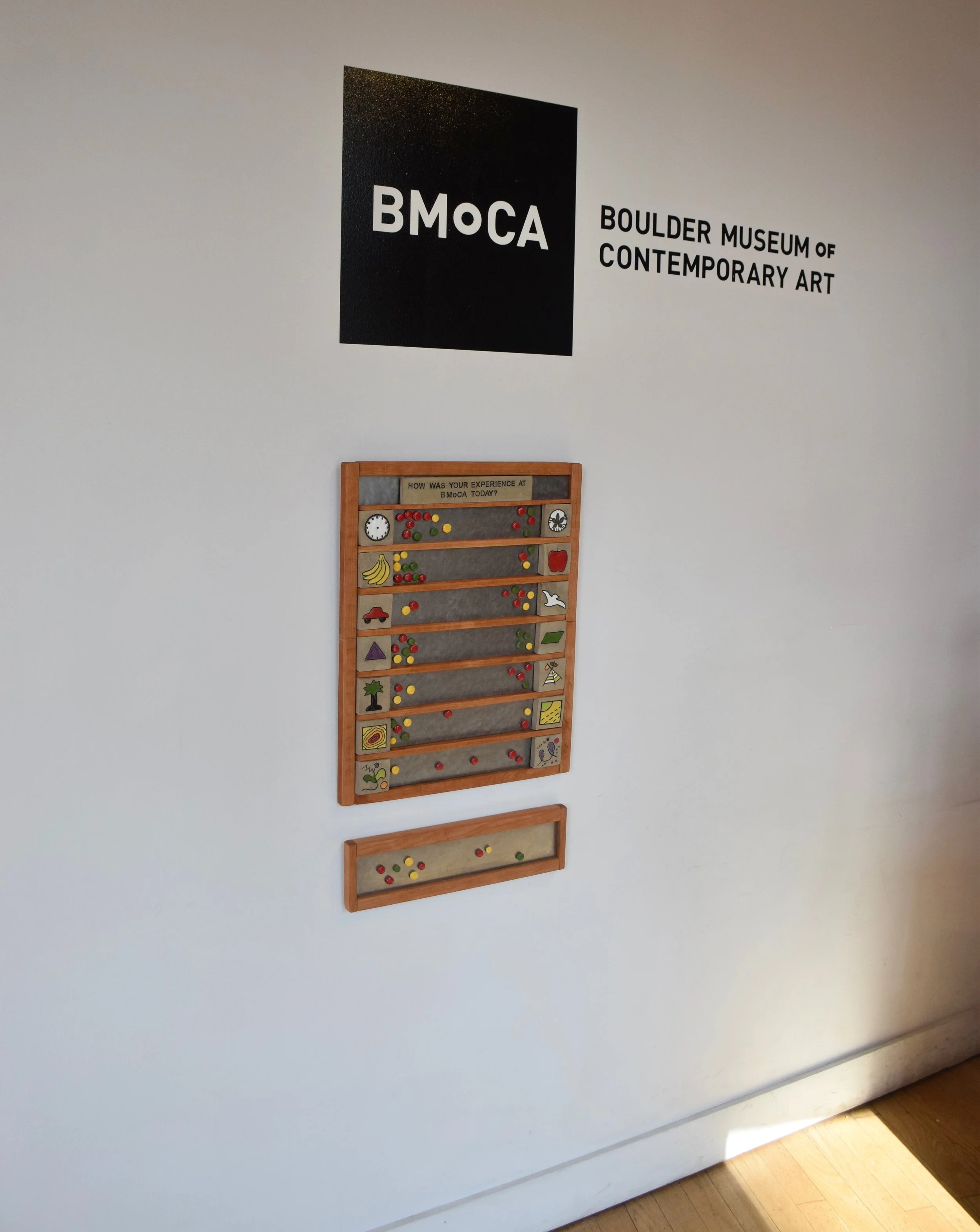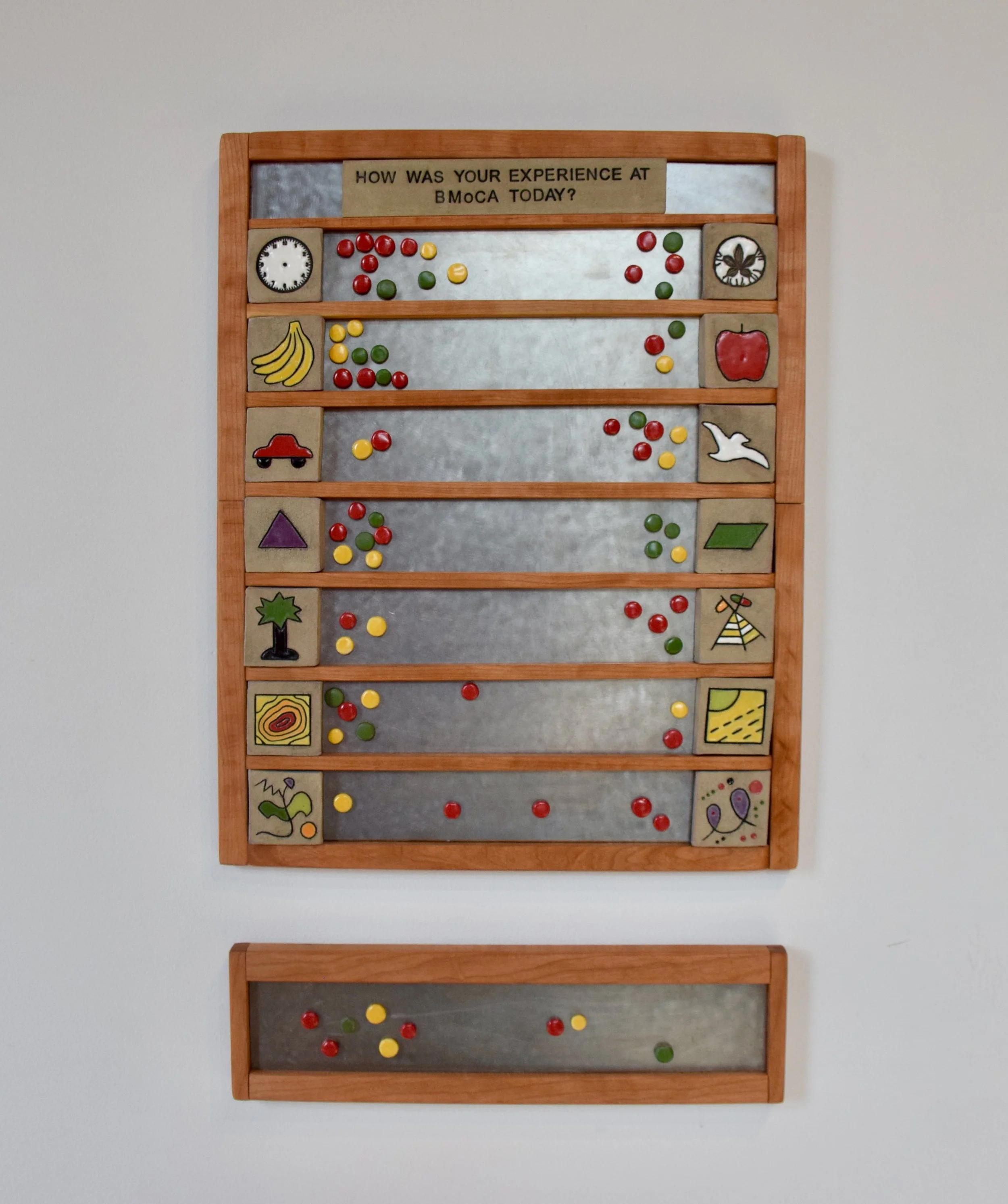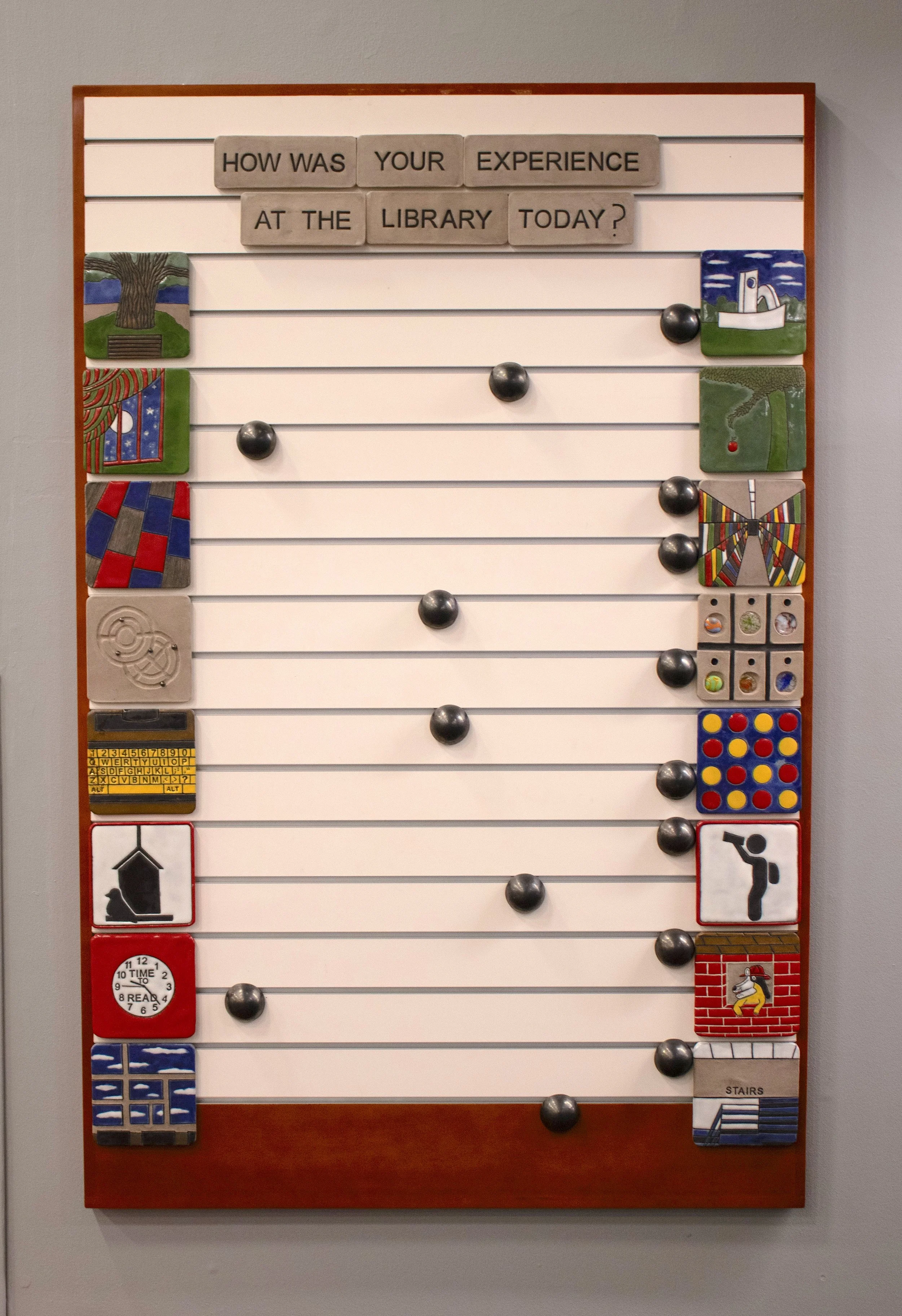 Okay, How Was Your Experience at the Library Today? So this piece invites visitors to qualify their experience at the library by moving these metallic semi-spheres across this slat board between tiles that depict different images.