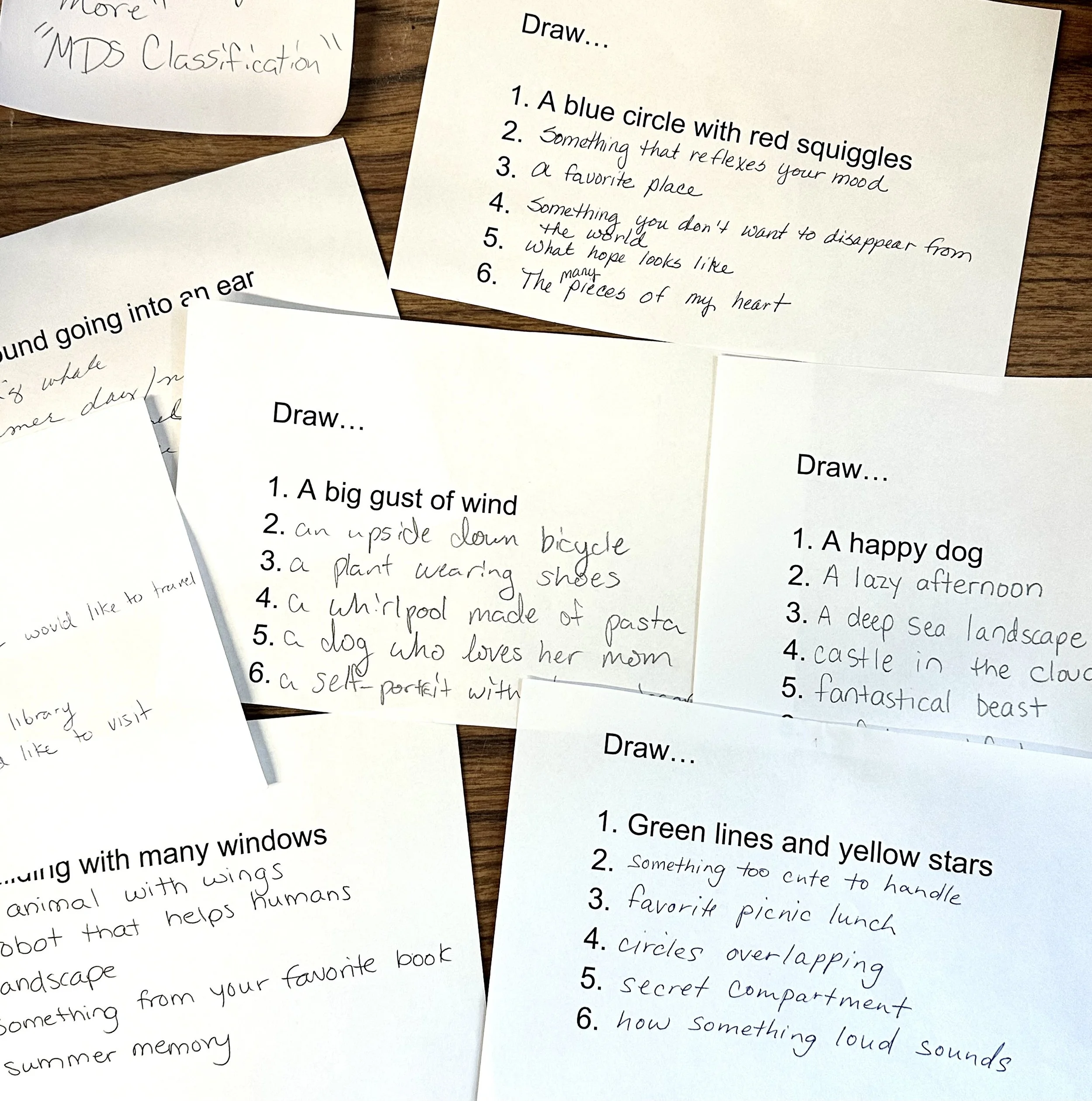 I also took a trip to Bemis and asked librarians and staff for drawing prompts. From my database of about 200 drawing prompts, I organized them into groups of 6, trying to imagine what prompt groups might make interesting drawings. My thinking around this method of sourcing prompts from my immediate networks, was to create a kind of parallel or foil to the way that Large Language Models like ChatGPT mine our data for their content.