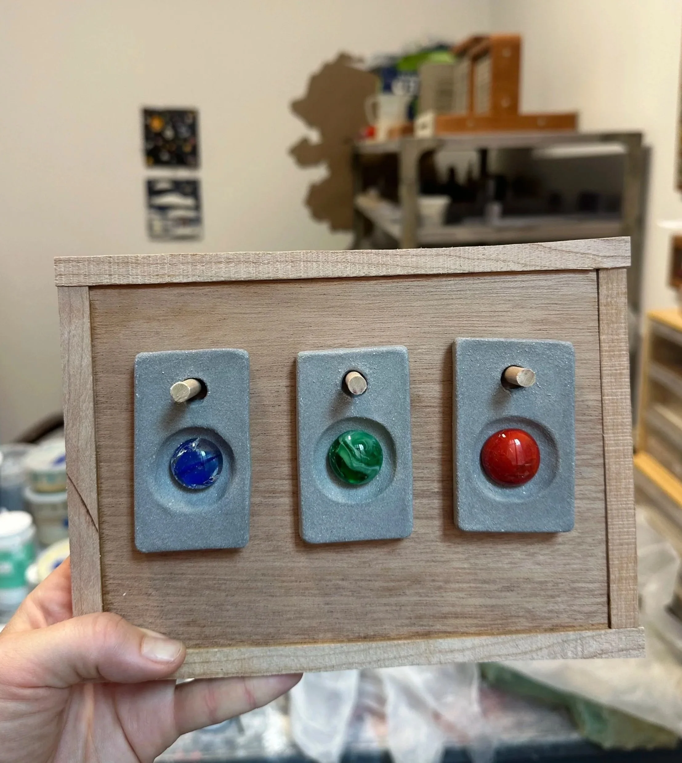 The Dewey Machine (2025) 90 marbles, ceramic, cherry wood, magnets