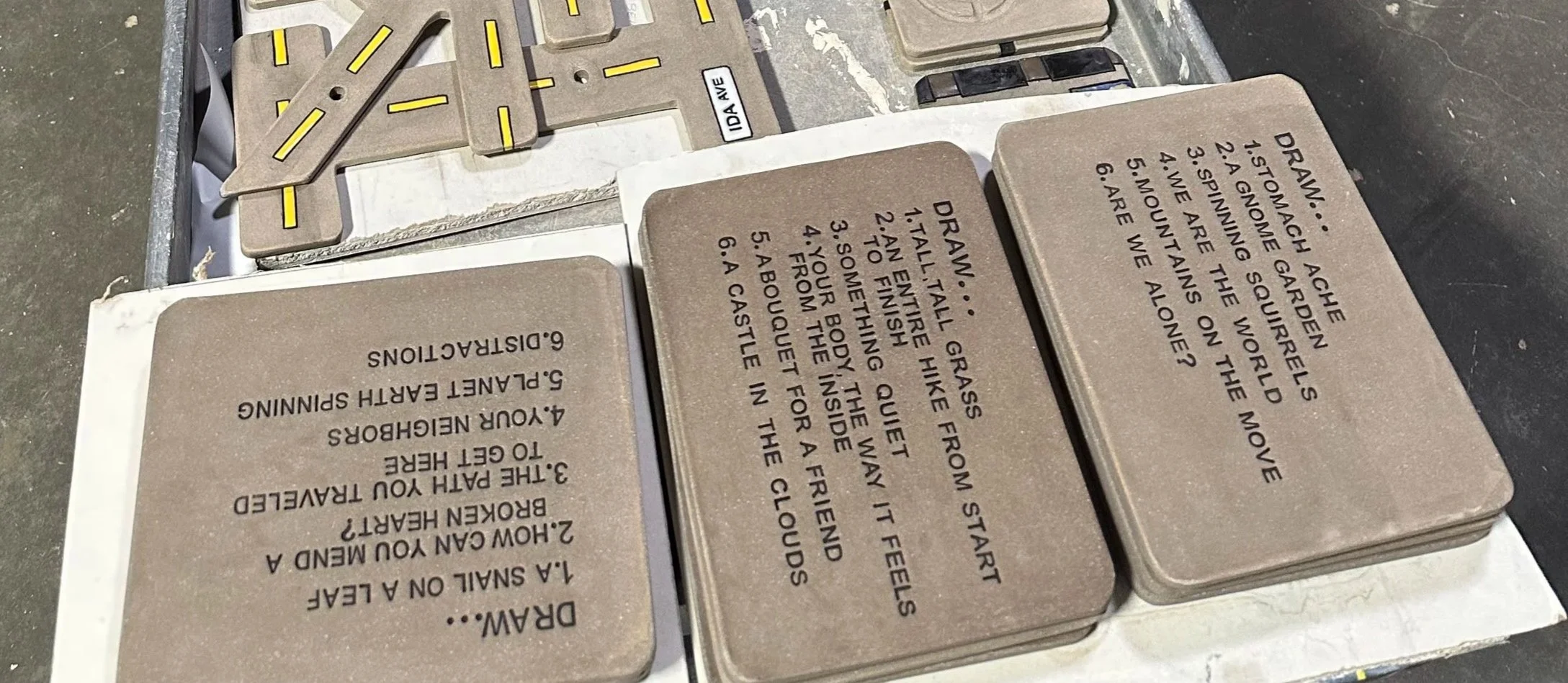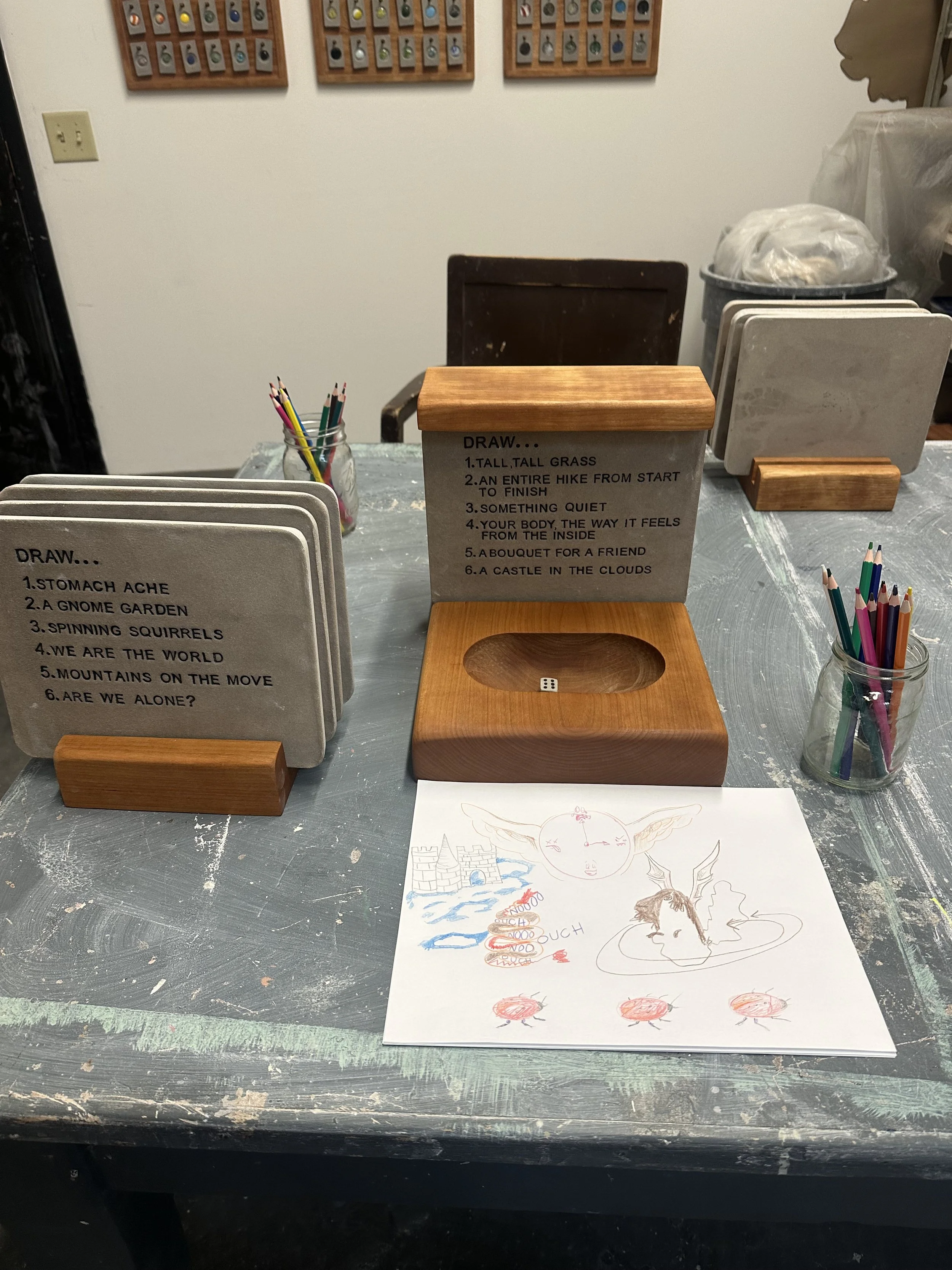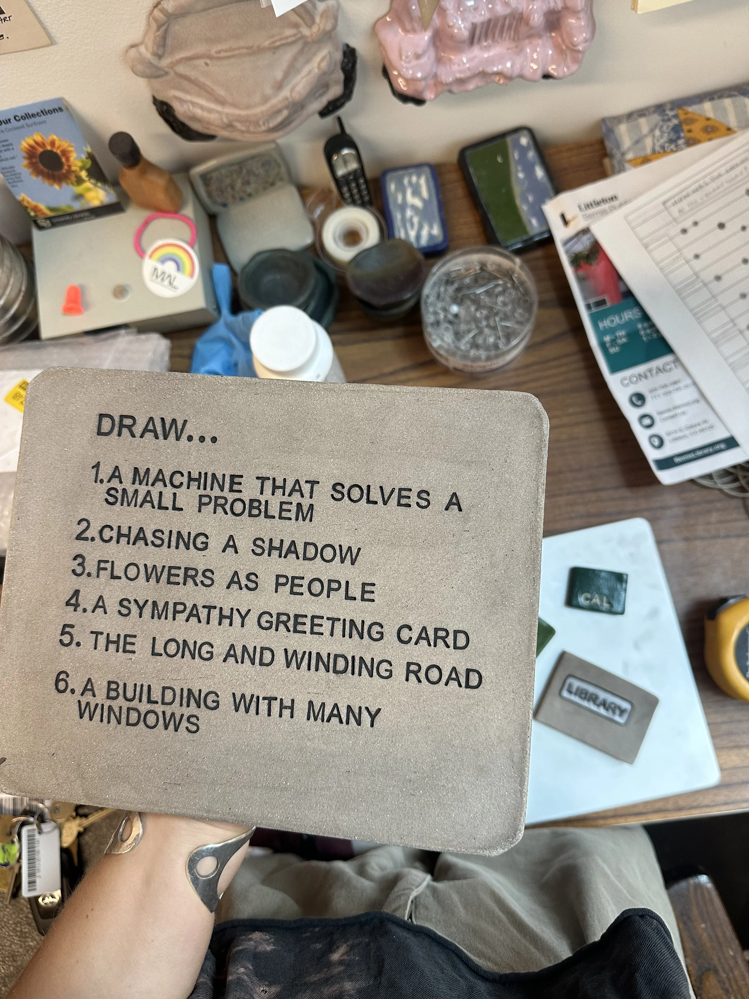 I stamped each set of drawing prompts into clay to create these ceramic “screens.”