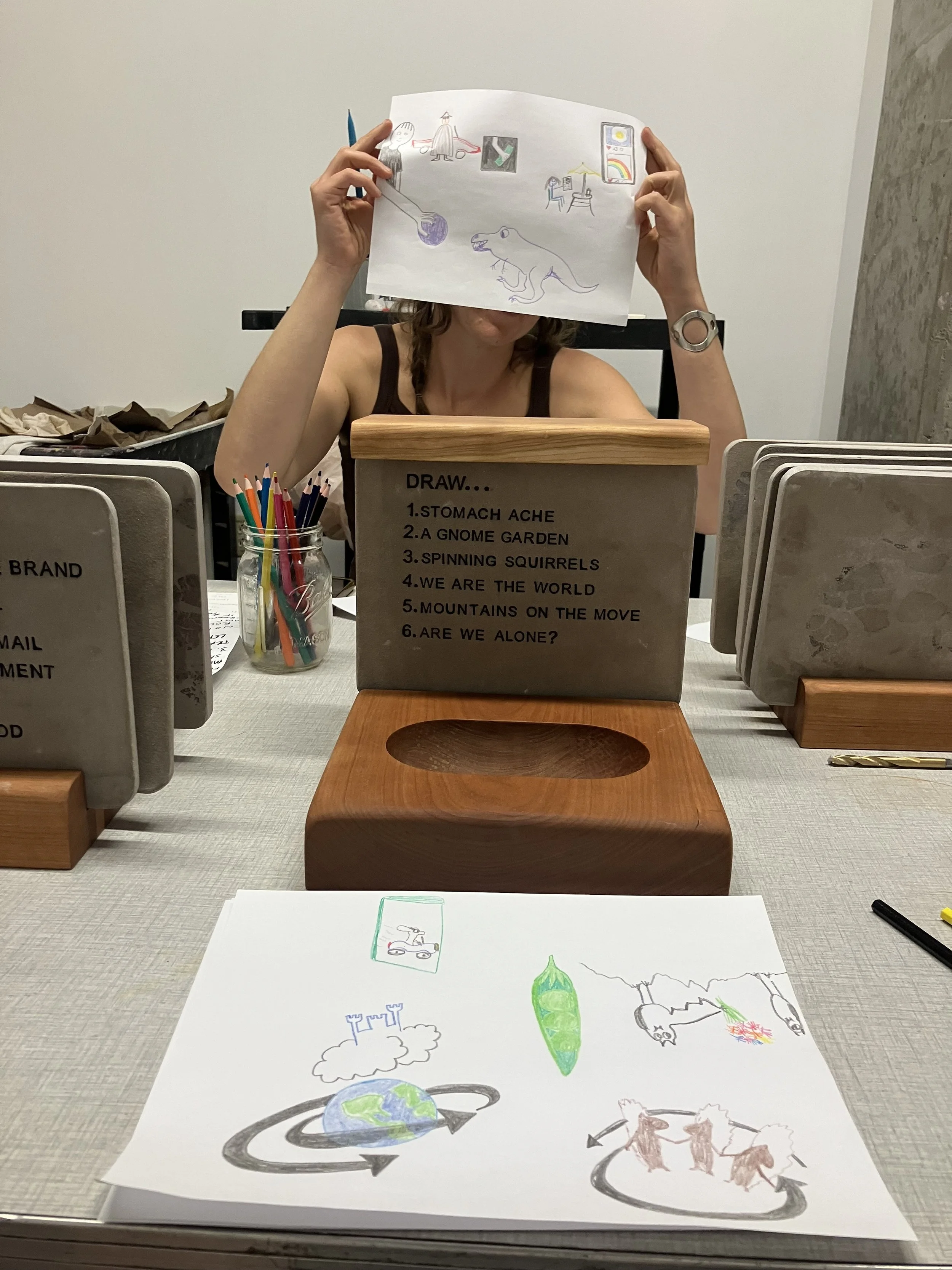 Okay, moving on to The Drawing Machine. The Drawing Machine is a different kind of interactive sculpture, its use entails two people rolling dice to determine what prompt the other will draw for 3 minutes. After 3 minutes, the players swap their drawings and roll the dice again to prompt each other to draw something else on each other’s papers. A round is complete when there are 6 drawings on each paper. In short, the function of The Drawing Machine is to make collaborative drawings.